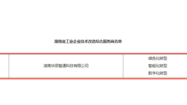 近日,湖南省工業(yè)和信息化廳正式公布湖南省工業(yè)企業(yè)技術改造綜合服務商入選名單,湖南華辰智通科技有限公司成功入選“綠色化轉(zhuǎn)型”、“智能化轉(zhuǎn)型”、“數(shù)字化轉(zhuǎn)型”三大類別服務商。